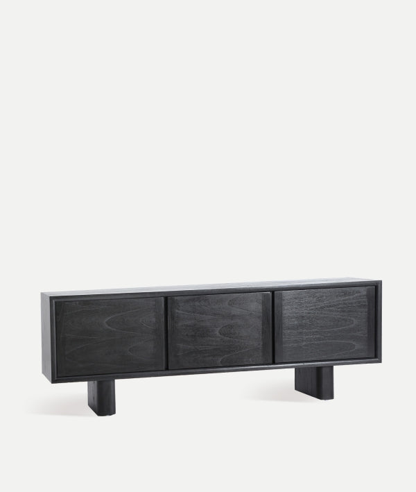ТВ шкаф Demmin в съвременен стил, изработен от черно дърво минди. Сдържана и елегантна мебел, която съчетава функционалност с минималистичен дизайн.