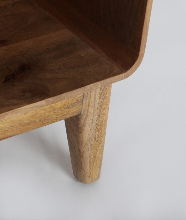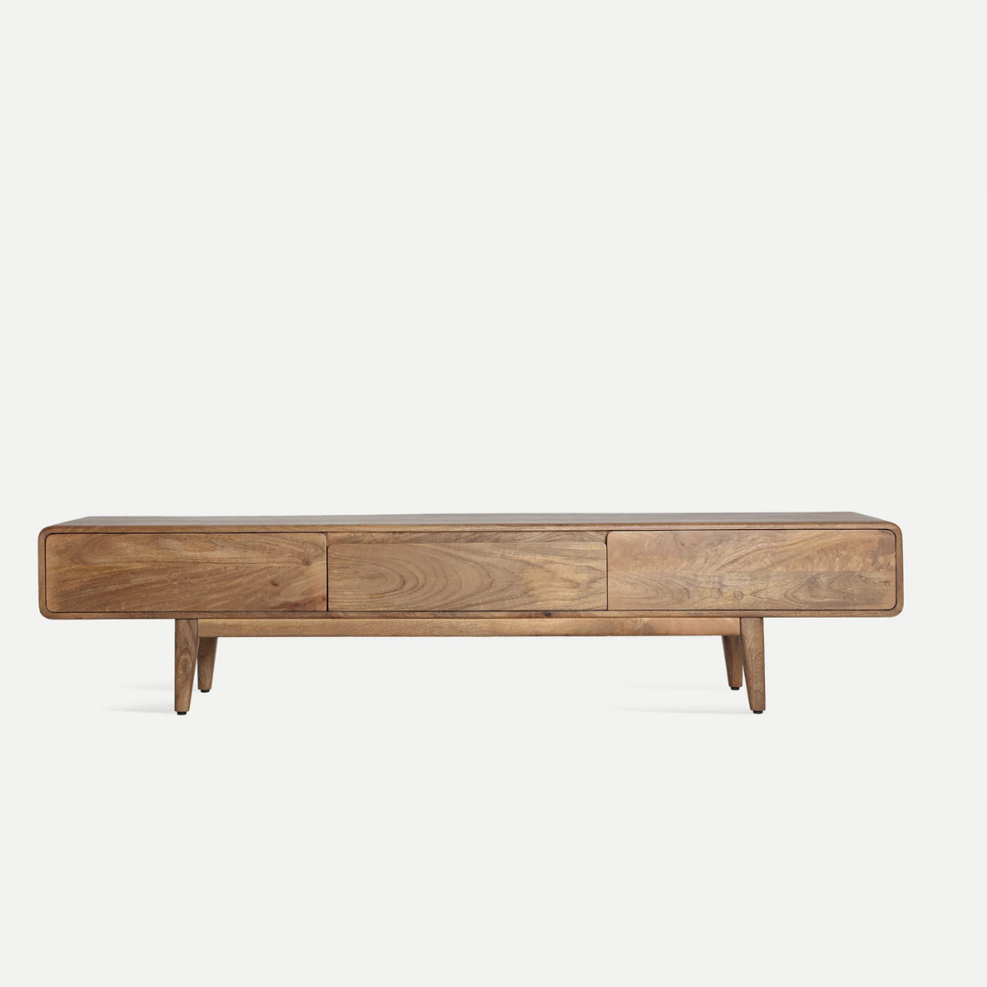 ТВ шкафът Finhan на KODU отразява скандинавската простота: естествен, ярък и балансиран. Изработен от кафяво мангово дърво и MDF, той носи топлина и визуална лекота.