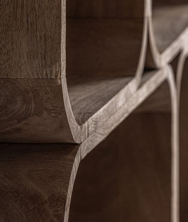 Органичен дизайн, който се лее естествено. Рафтът FLOW от KODU е изработен от мангово дърво, скулптурно произведение, което съчетава структура и визуална лекота. Неправилното му разположение на модулите подканва към динамични композиции, идеални за проекти, търсещи движение и формална хармония.