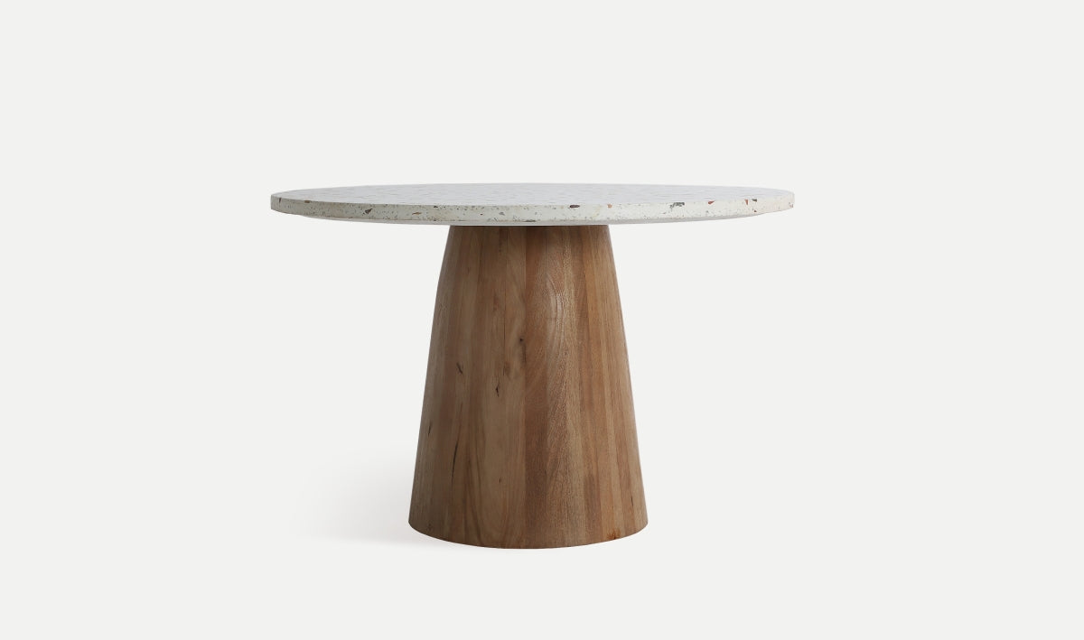 Трапезната маса Lautrec от KODU съчетава естествени материали с елегантен скандинавски дизайн. Нейният бял терацов плот е поставен върху конична основа от мангово дърво в кафяви тонове, създавайки скулптурно присъствие, което кани да споделите моменти. Маса, която съчетава здравина, стил и естественост.