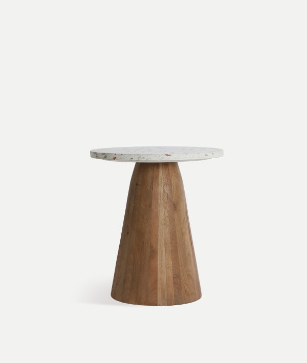 Страничната масичка Lautrec от KODU преосмисля простотата на скандинавския стил. Тя съчетава бяло терацо с топлината на манговото дърво, създавайки повърхност, изпълнена с текстура и индивидуалност. Перфектна е като странична масичка или за подчертаване на любима лампа или растение.
