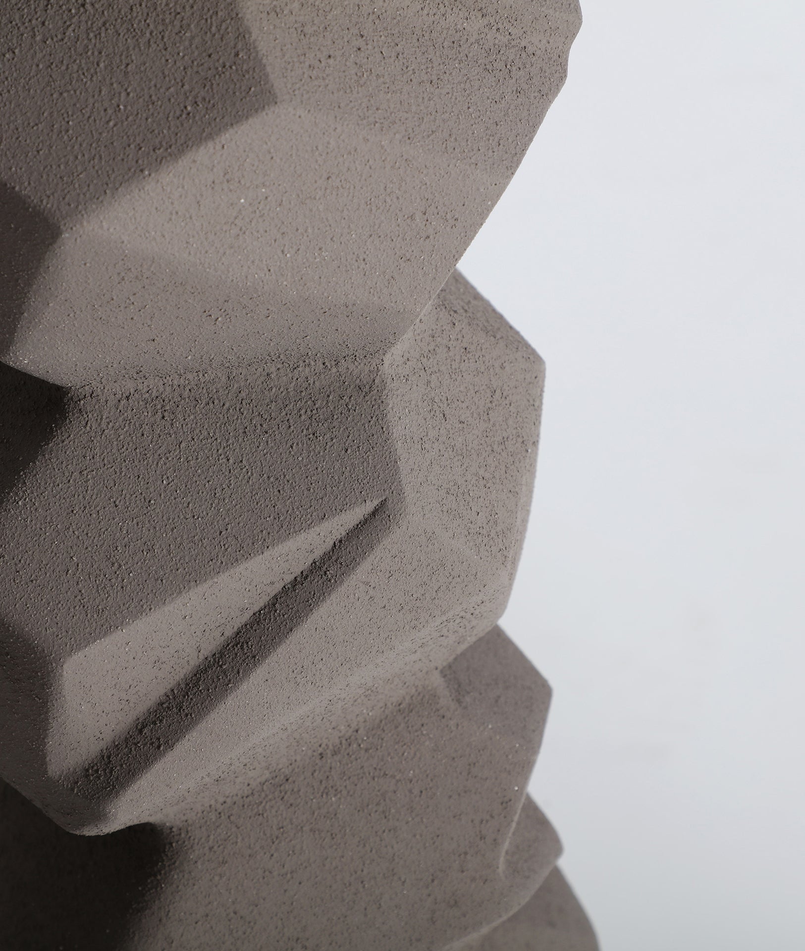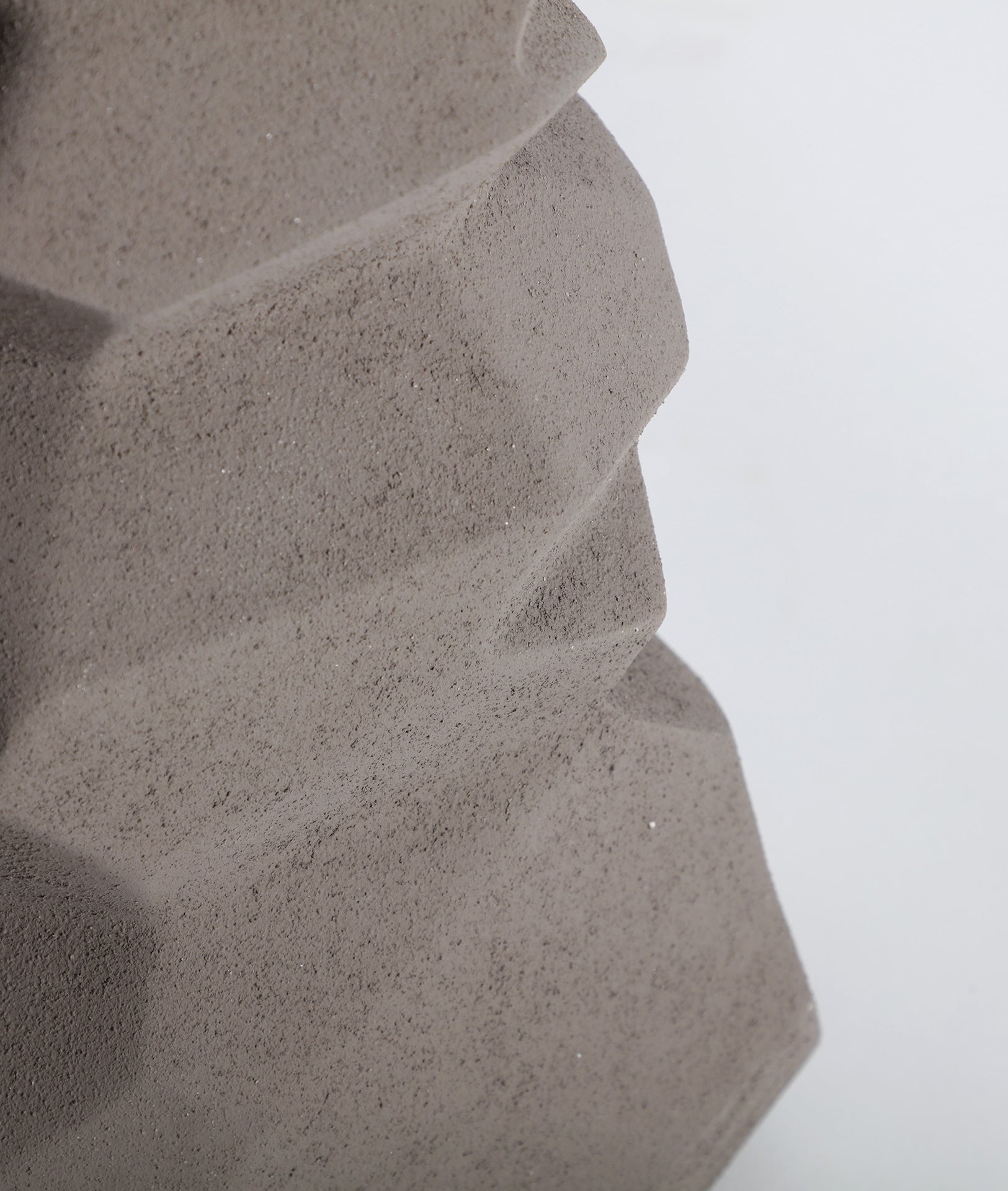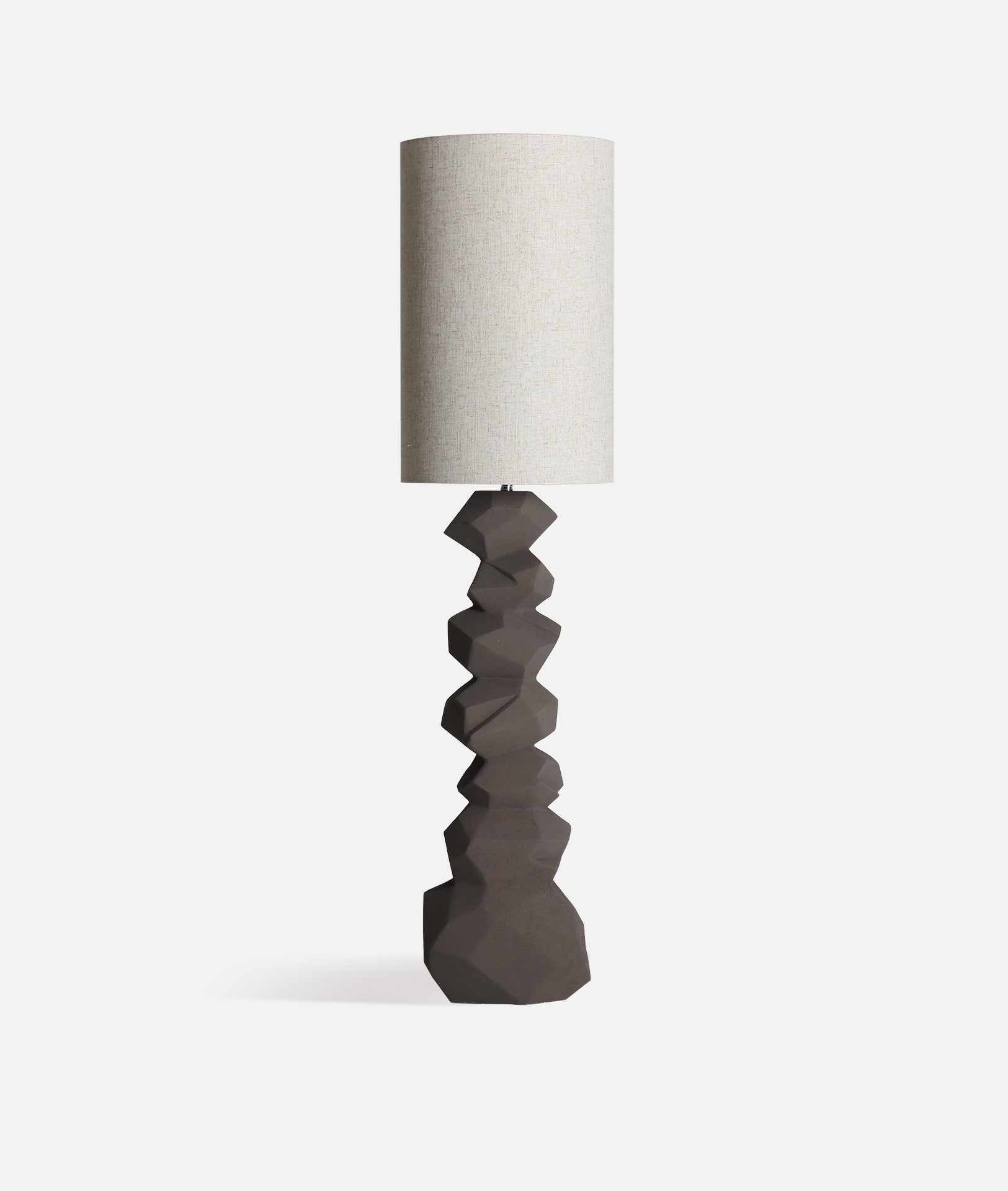 Здравина на материала и скулптурно присъствие. Подовата лампа PEDRA от KODU съчетава сива керамична основа с грубо покритие и почти бял текстилен абажур. Дизайнът ѝ, вдъхновен от масивността на резбования камък, добавя характер и текстура към проекти, които ценят автентичността и естествената хармония.