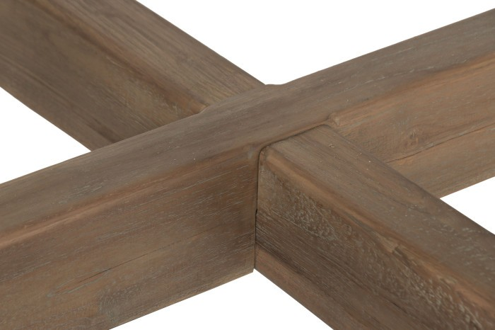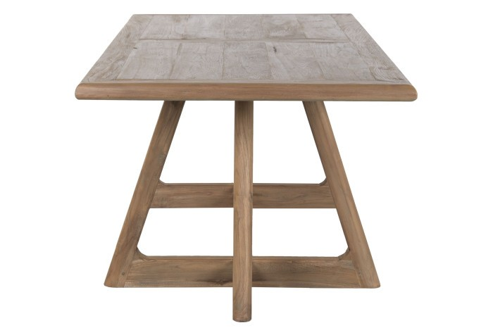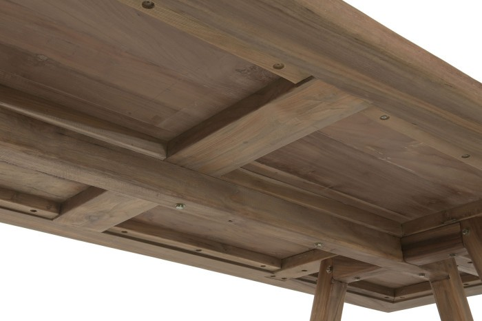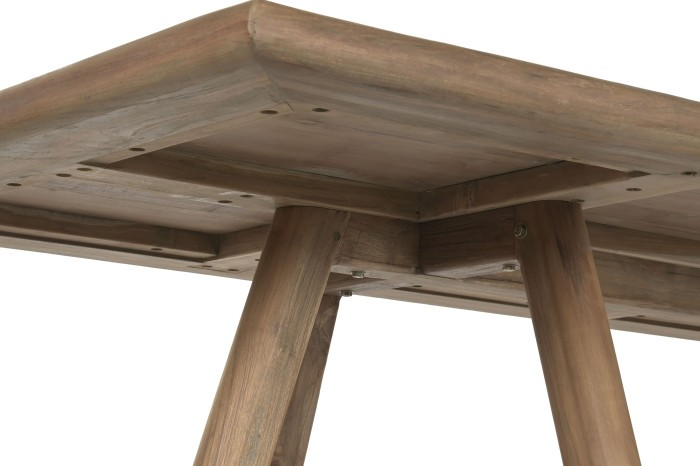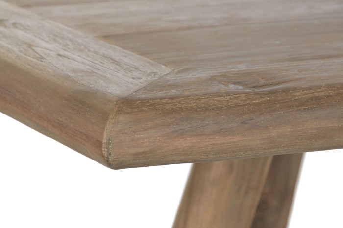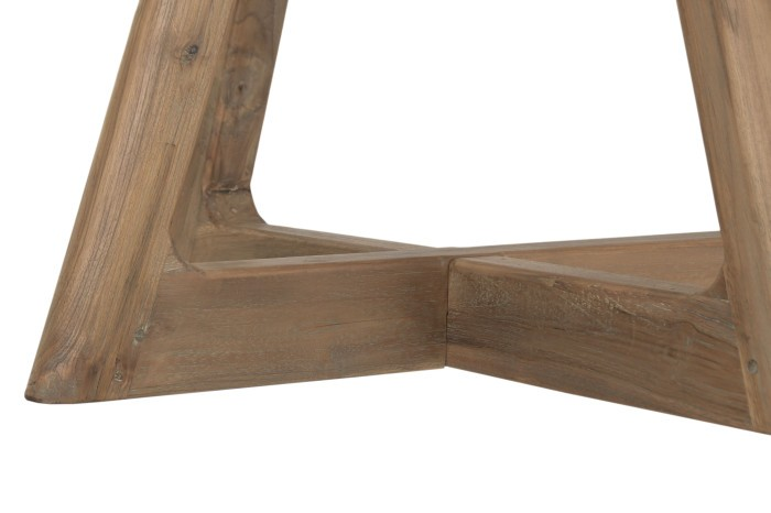 Нашата трапезна маса от рециклирана тикова дървесина въплъщава философията, че истинският лукс се определя от почтеността, дълготрайността и отговорната изработка. Всеки елемент е изработен от регенериран тик, добит от стари конструкции, което дава втори живот на дървото, като същевременно запазва богатия му характер и естествена устойчивост. Резултатът е маса, която носи история в своите жилки, но същевременно изглежда безпогрешно модерна по форма и присъствие.