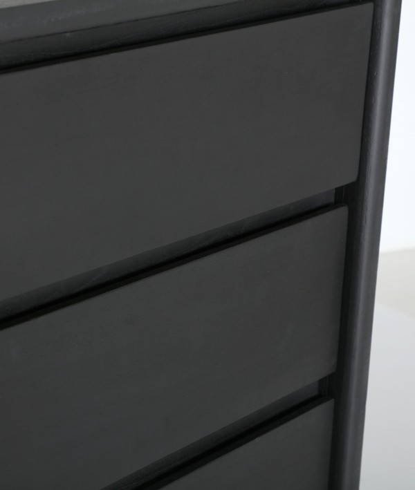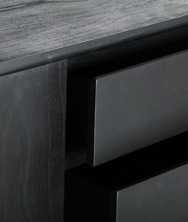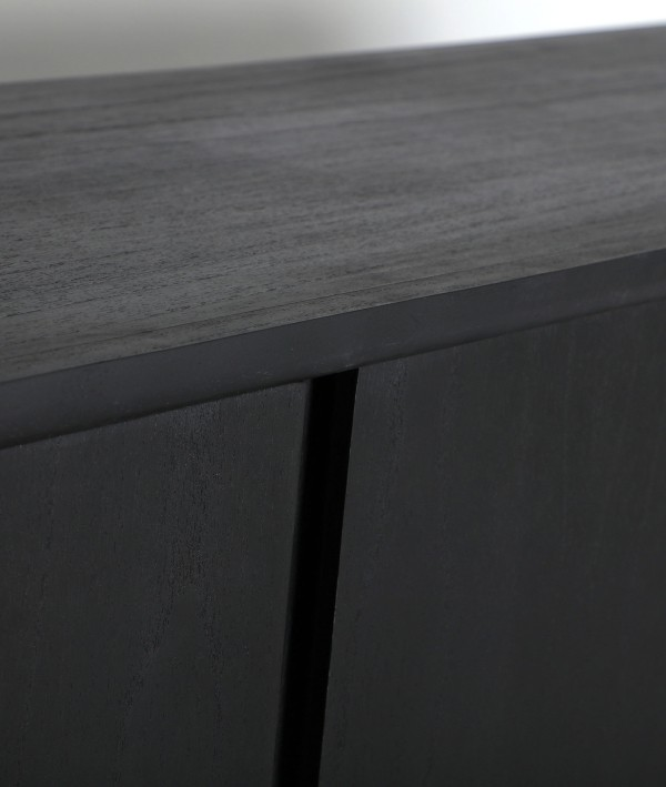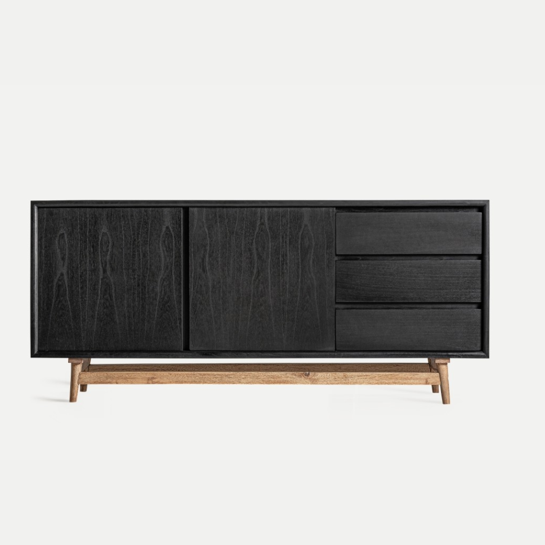 Бюфет от черно дърво минди, с размери 180 x 40 x 80 см, идеален за модерни трапезарии или дневни. Конструкцията му включва врати и основа от естествено дърво, добавящи елегантен контраст. Този бюфет е идеален за съхранение на прибори за хранене, текстил или декор, съчетавайки функционалност със съвременен дизайн. Черното му покритие и дървената основа създават скандинавски и изтънчен стил, което го прави декоративен и практичен елемент, който добавя модерност към пространството.