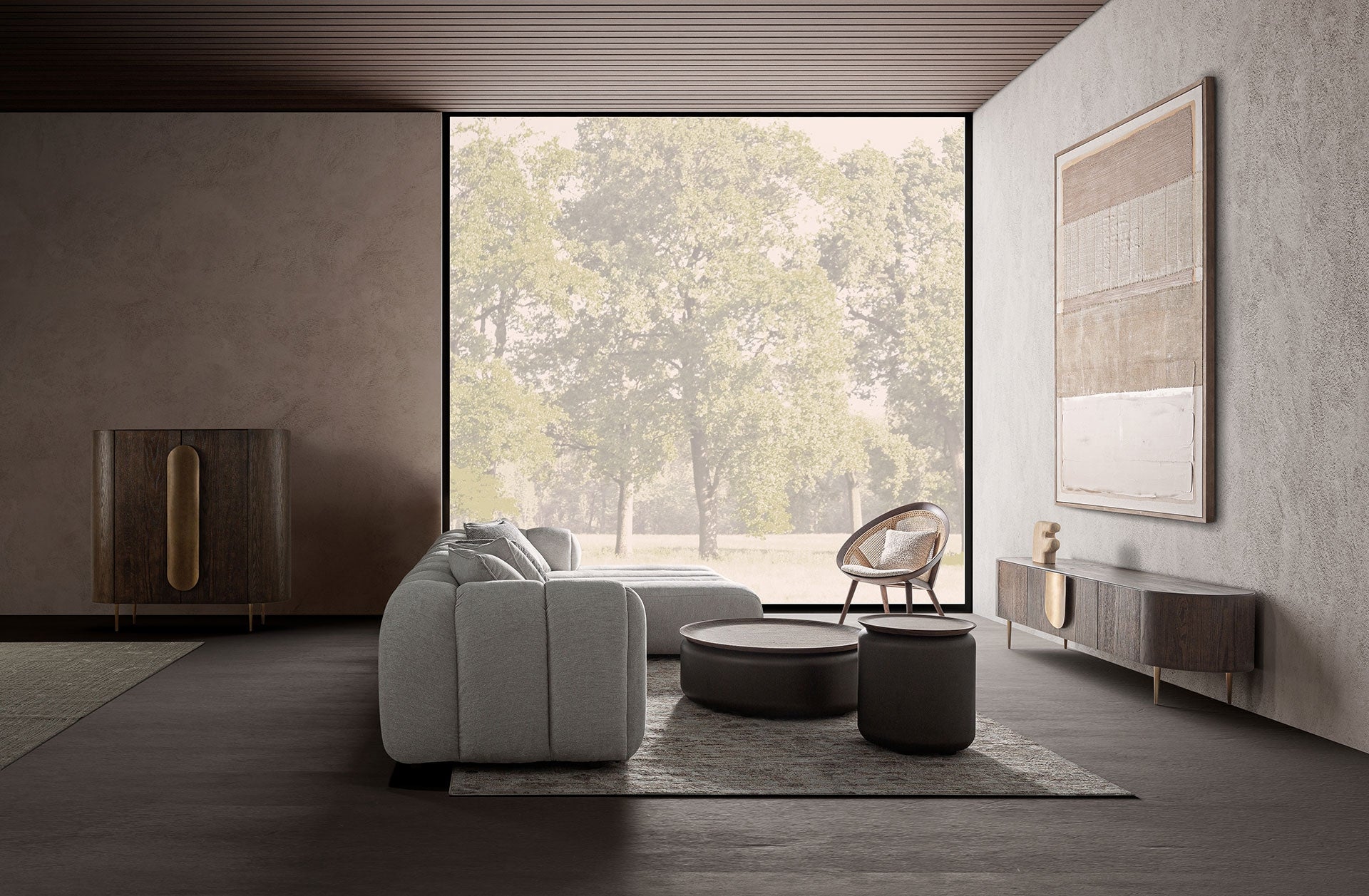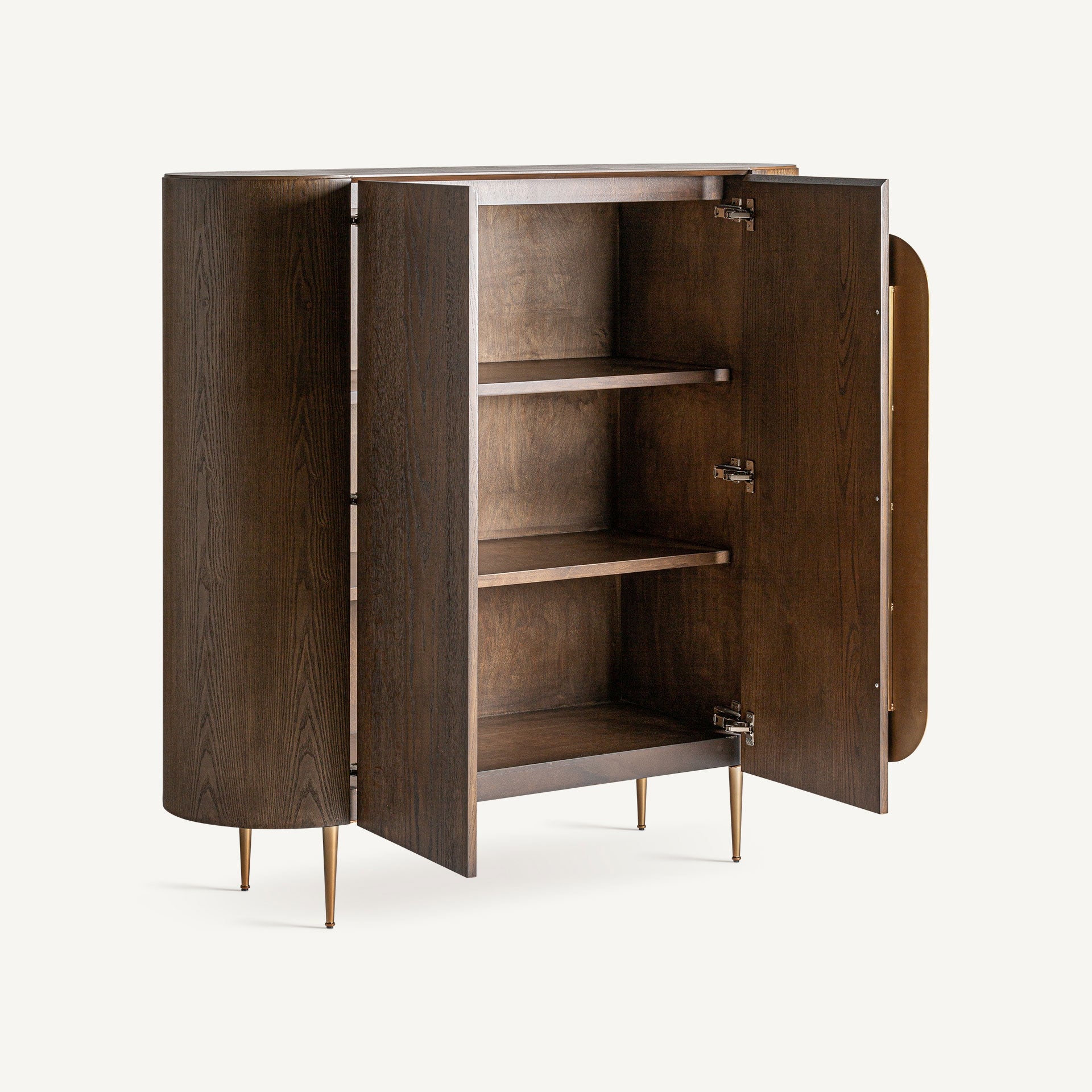 Една VICAL мебел с присъствие и баланс: гардеробът Treignac. Неговото покритие в цвят байцван дъб и матово златна стоманена конструкция го правят решение за съхранение с характер и изтънченост.