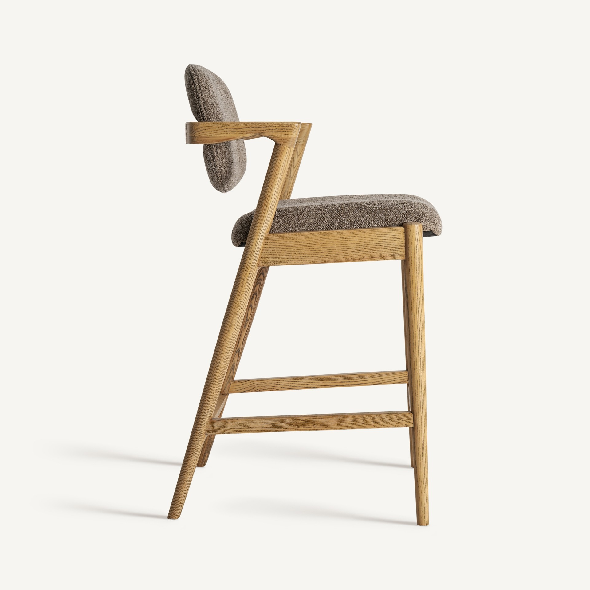This barchair features a solid ash wood frame paired with durable polyester upholstery in a refined brown tone. Its ergonomic backrest and integrated footrest ensure comfort during extended use, while reinforced leg supports provide lasting stability. The modern executive design, highlighted by the light ash wood base, complements kitchen islands, bar counters, showrooms, and boutique office environments with natural elegance and professional appeal.