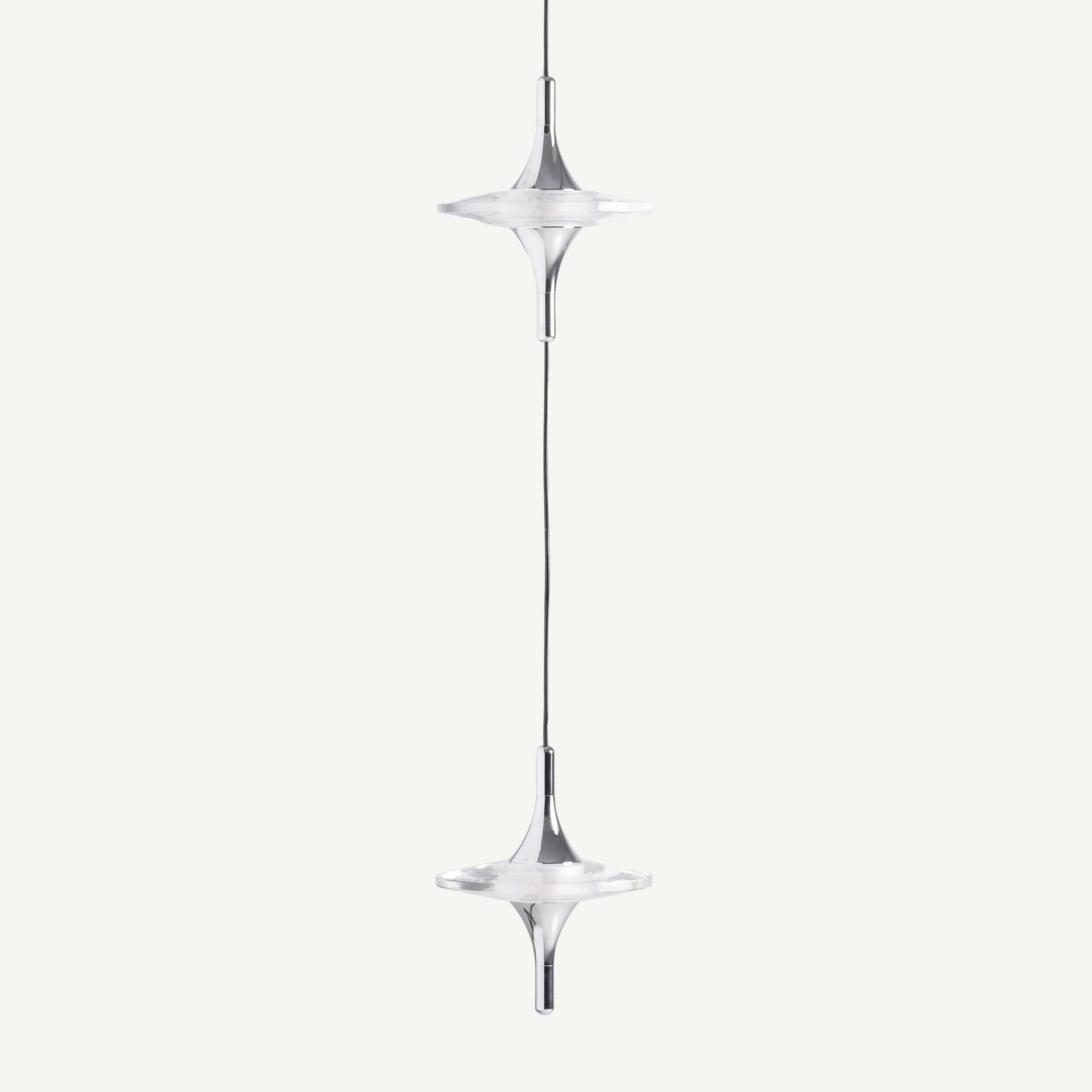A sculptural ceiling lamp that blends futuristic elegance with artisanal precision. Featuring a symmetrical design with a faceted transparent disc and polished metallic ends, this piece creates a captivating play of light and form. Ideal for modern interiors, boutique spaces, or gallery-inspired environments.