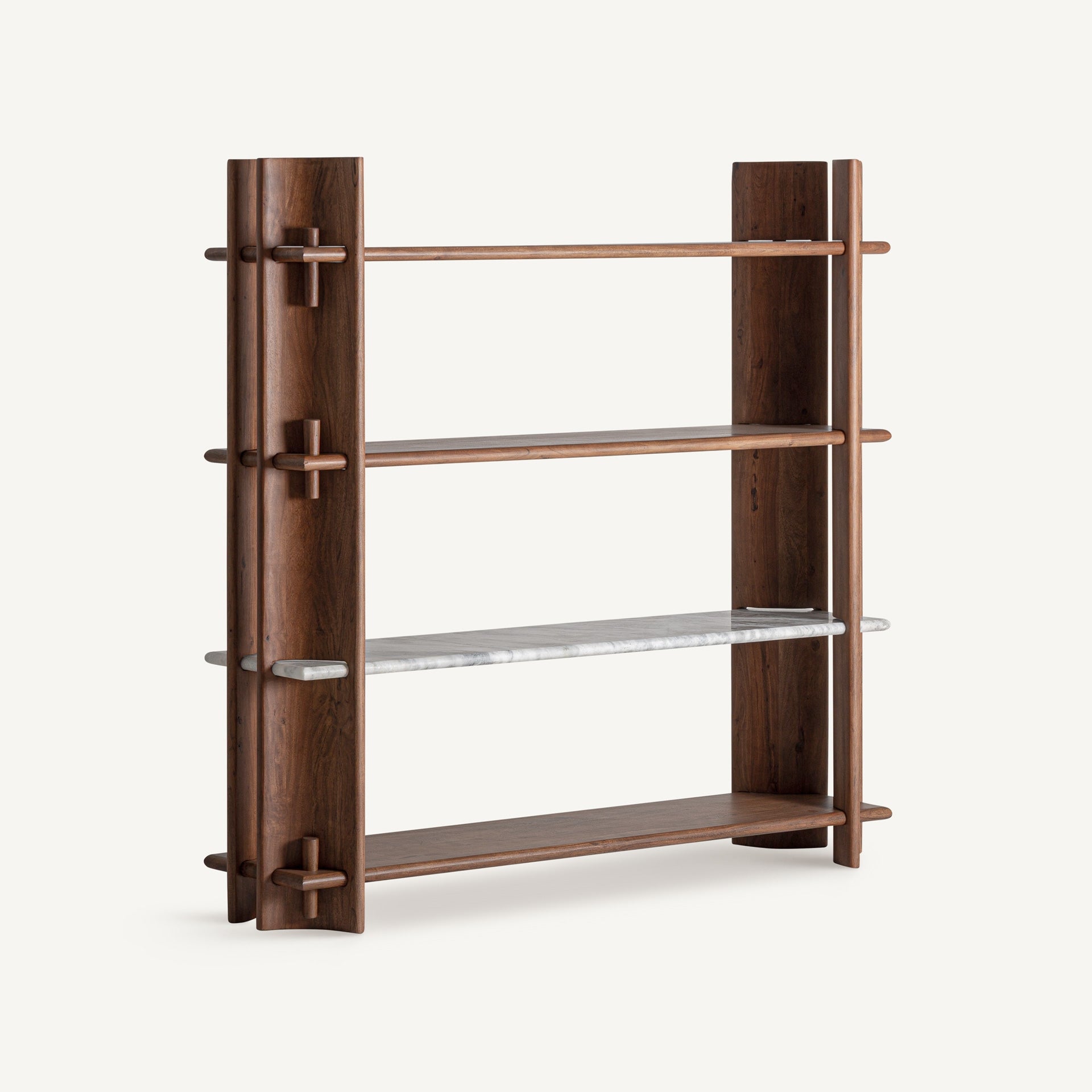 Bookcase, made of acacia wood in brown, combined with white marble.