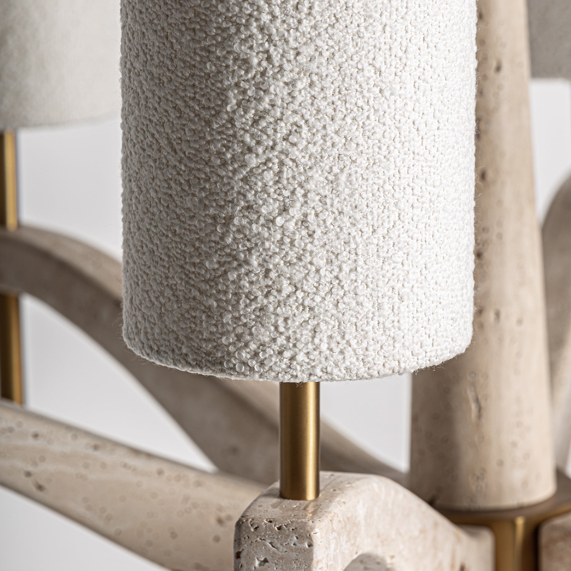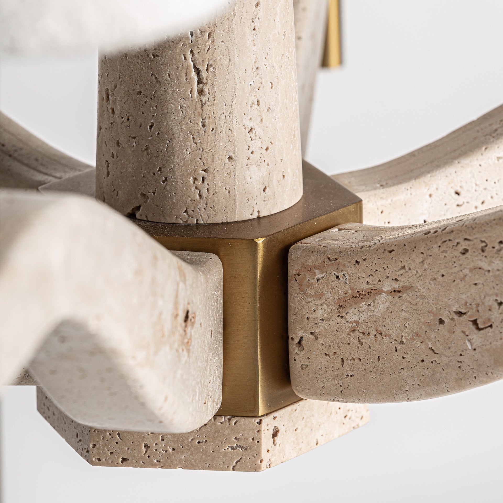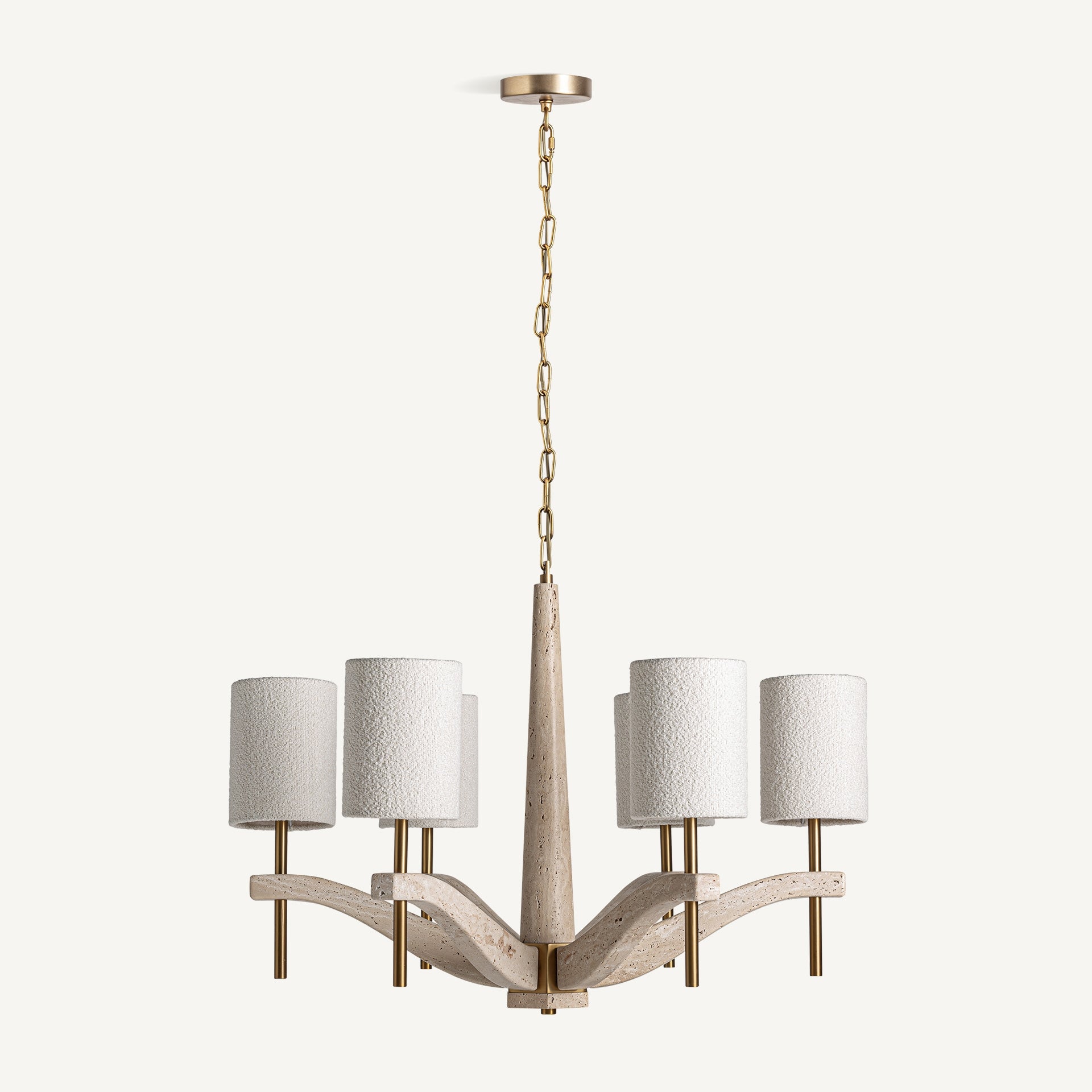 Ceiling lamp, made of marble in beige, combined with golden metal and off white polyester.