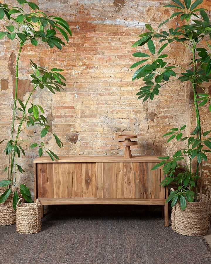 - The EROSI 160 sideboard stands out for its adaptability to any space and a truly authentic decorative style. A horizontal sideboard in natural recycled teak wood with a rustic style, straight lines and Japanese-style sliding doors, behind which hides a functional chest of drawers, also in teak wood. It belongs to the EROSI family, characterised by the use of noble and sustainable materials embellished by the unmistakable marks of the erosion of time. A sideboard made of teak wood recovered from old disused buildings in Indonesia, which gives it that authentic personality, despite the simplicity of its design. The perfect versatile and functional addition to any room.
