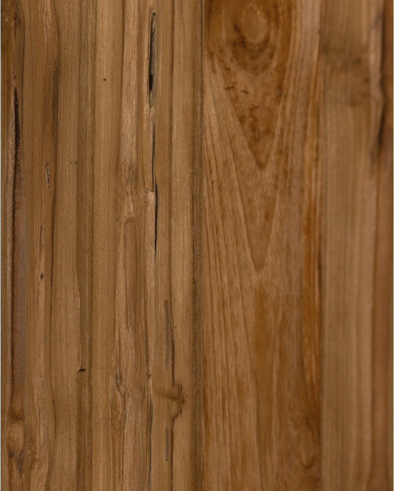 - This unique wooden shelf stands out for its character and presence. It is part of the EROSI collection, which is characterized by its robust structure made entirely of natural reclaimed teak, and with an eroded finish, respecting the original color and texture of the wood. This narrow shelf, with a classic and modern air at the same time, is a must-have for those who love timeless decoration. With a design that combines aesthetics and functionality, its structure is divided into twelve rectangular spaces where you can place all kinds of objects, combine with a bookcase or with other decorative elements. Made with sustainable recycled wood from old abandoned buildings in Java, Indonesia, the EROSI L NAT has everything to become the favorite piece of furniture in your living room, hallway or bedroom. Perfect to give an organic and vintage touch to any style of decoration, and very combinable with other wooden furniture and natural textures.