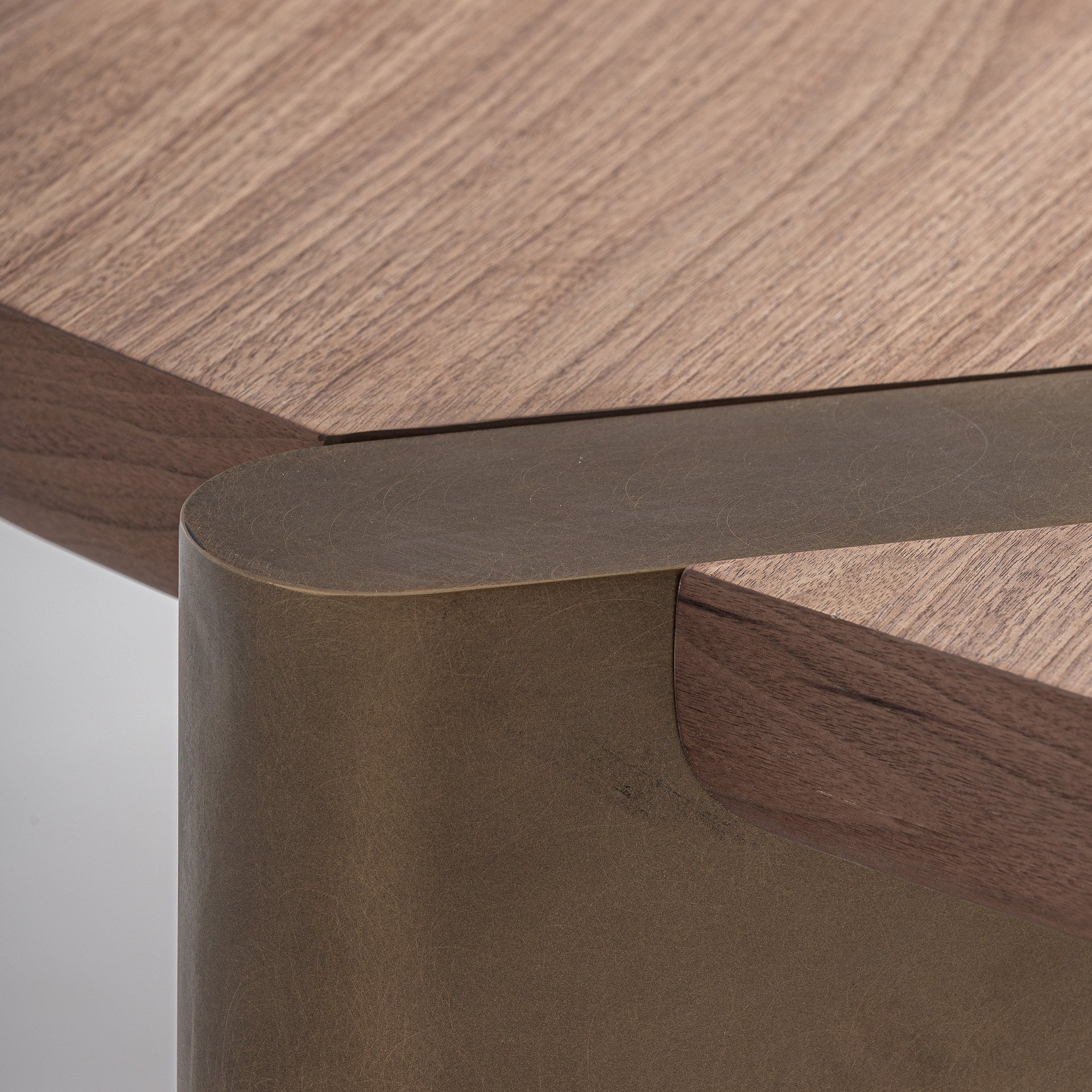 Lausana desk, style art deco, made of walnut veneer in walnut with a glossy finish, combined with brown mdf wood with a matte finish and copper stainless steel with a brushed finish. Product detachable.