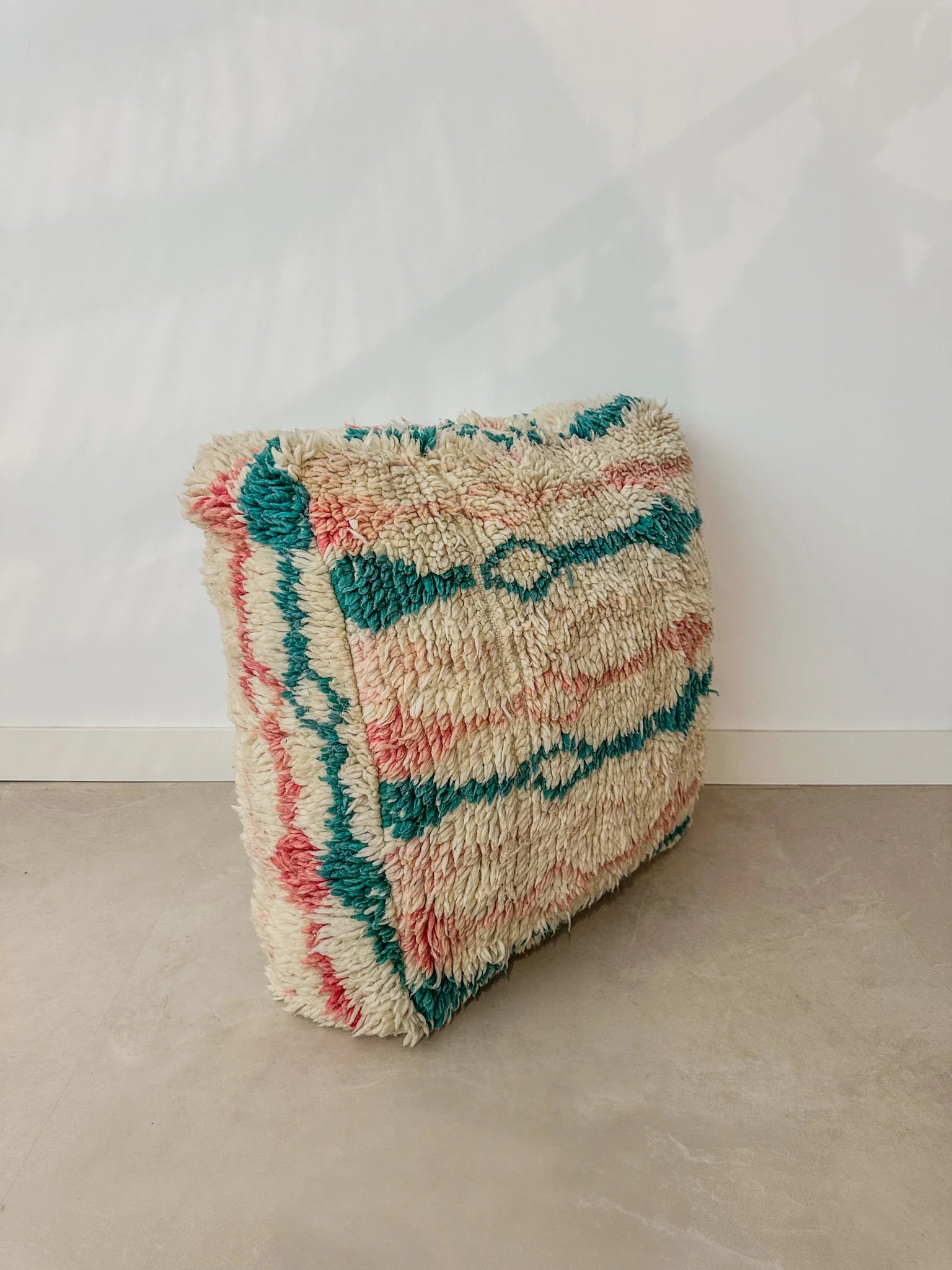 Each pouf is handmade from a vintage Moroccan rug and is a unique masterpiece! The pouf is a real statement piece, the rich colors and characteristic appearance of the pouf make it a striking item that adds warmth and character to any space.