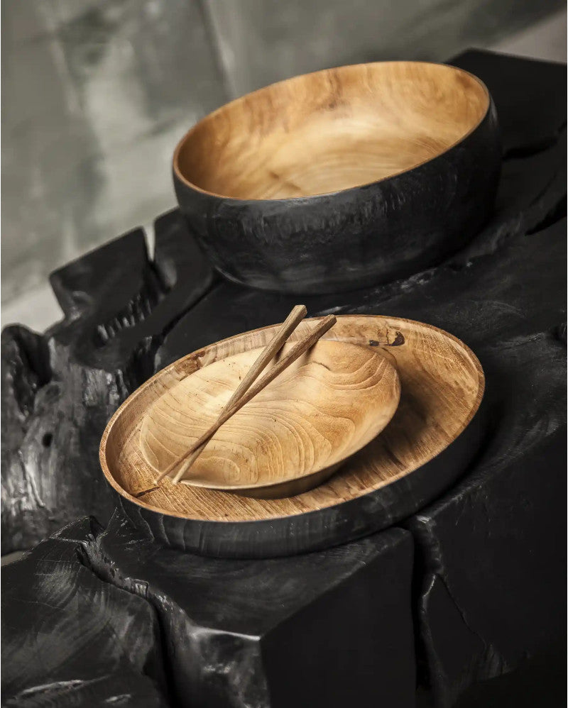 - NITON bowl, made of smooth two-tone teak root, with a natural finish on the inside and matt black on the outside. It is available in a taller version, 10 cm in diameter, which can be combined together to create elegant, oriental-inspired table settings.
