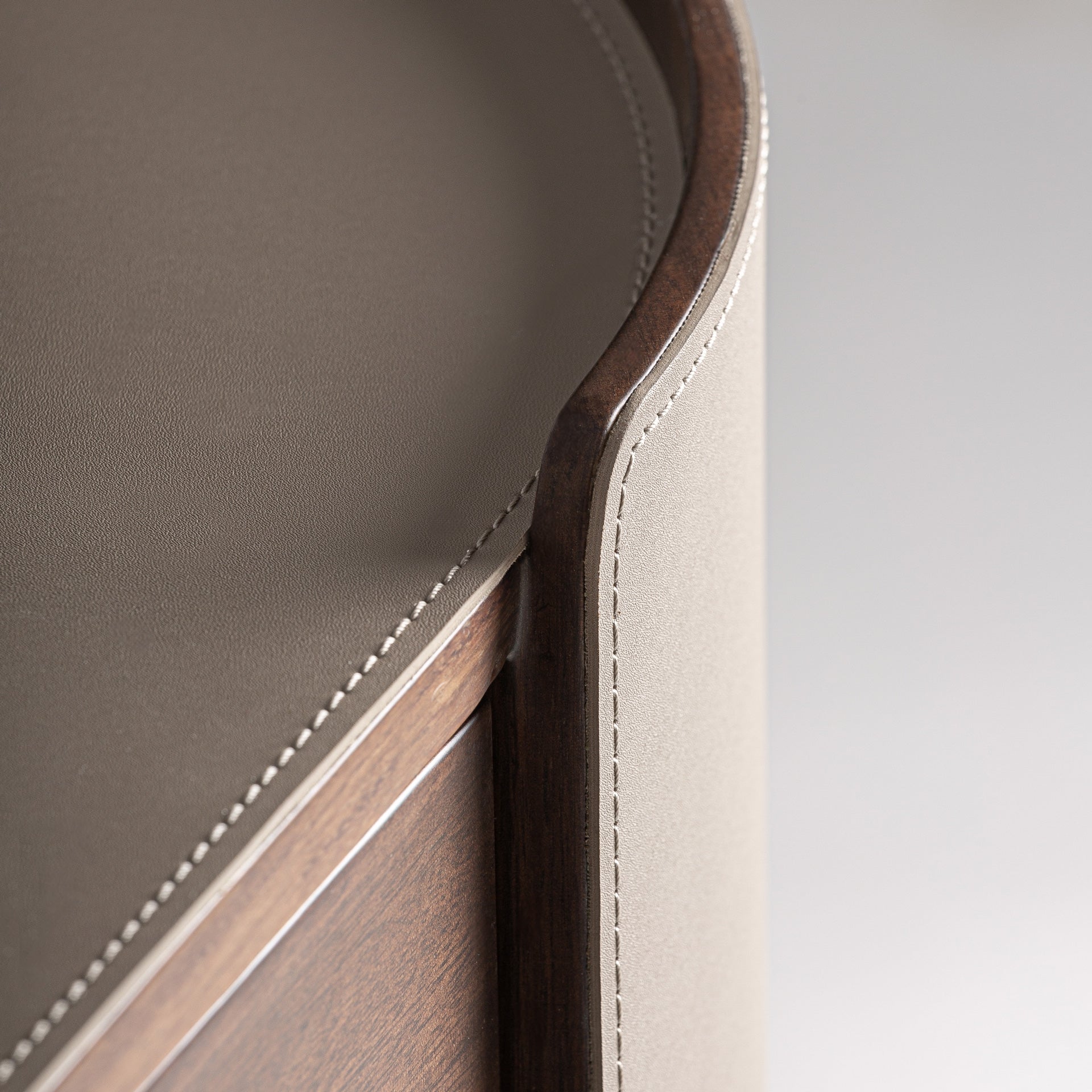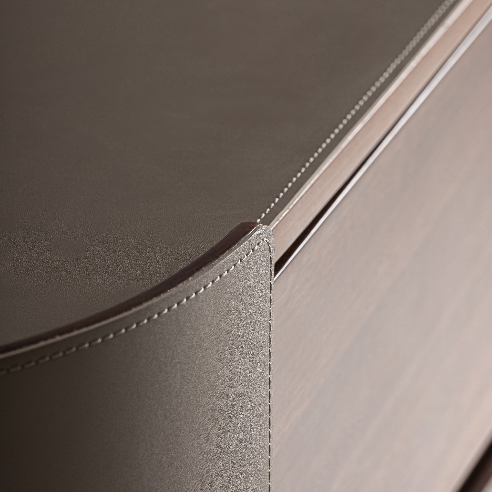 Giswil chest of drawers, style contemporary, made of plywood in brown with a matte finish, combined with brown eucalyptus veneer with a brushed finish and beige fakeleather with a matte finish.