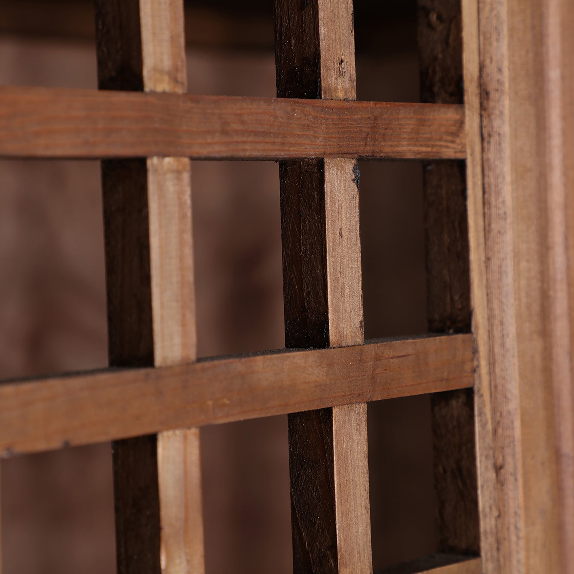 The double doors feature a distinctive lattice-inspired upper panel and solid lower sections, adding texture and visual interest. Finished with aged metal ring handles and supported by sturdy legs.