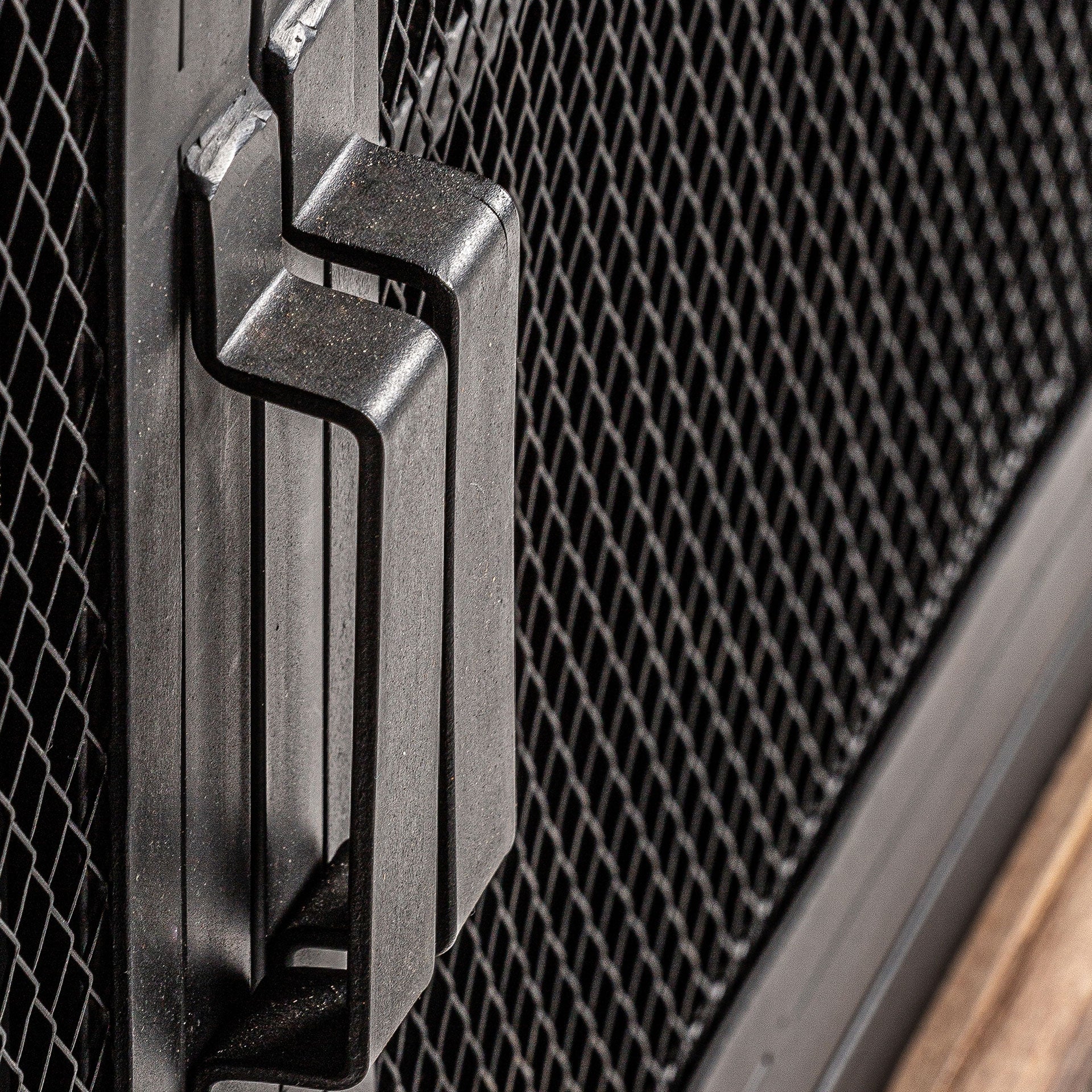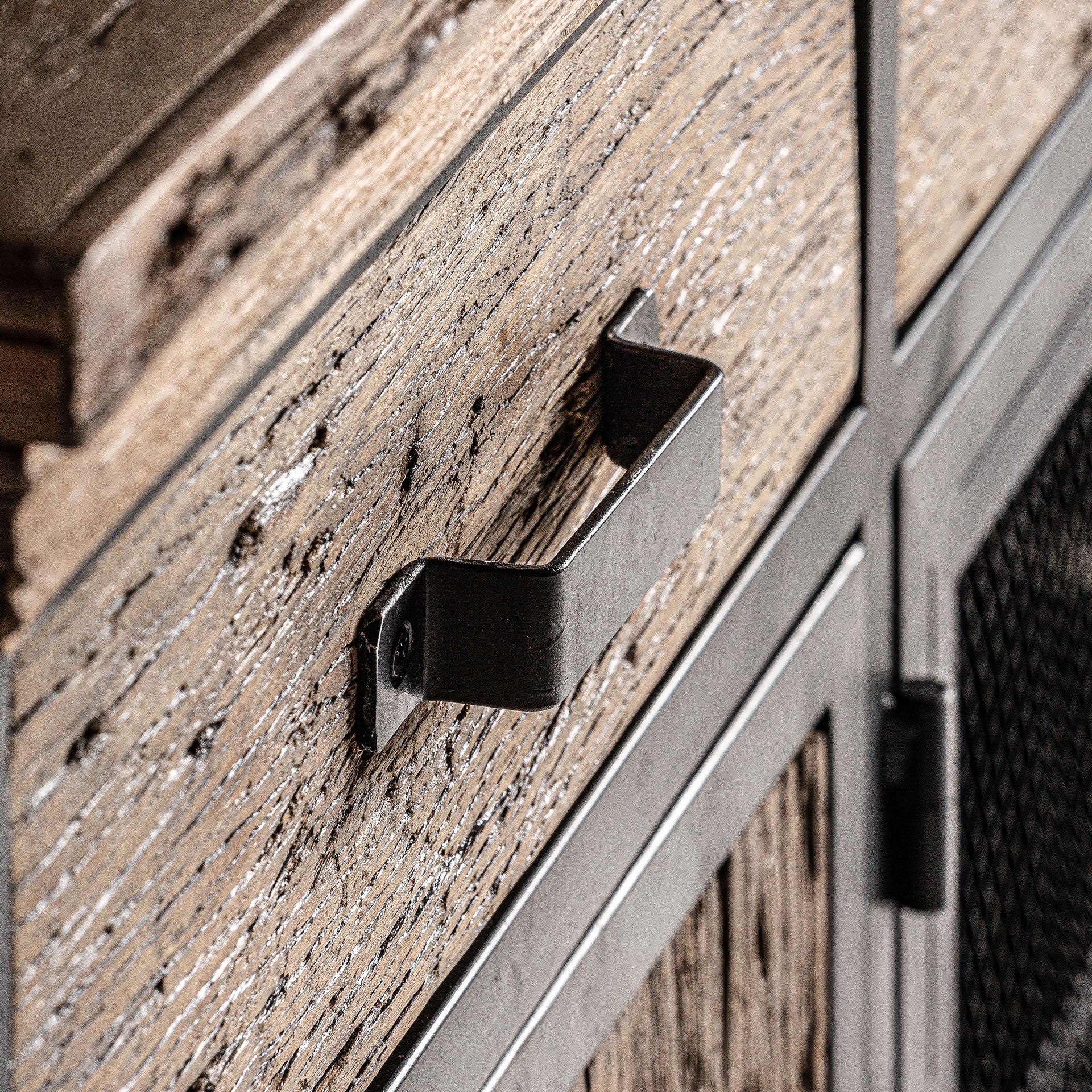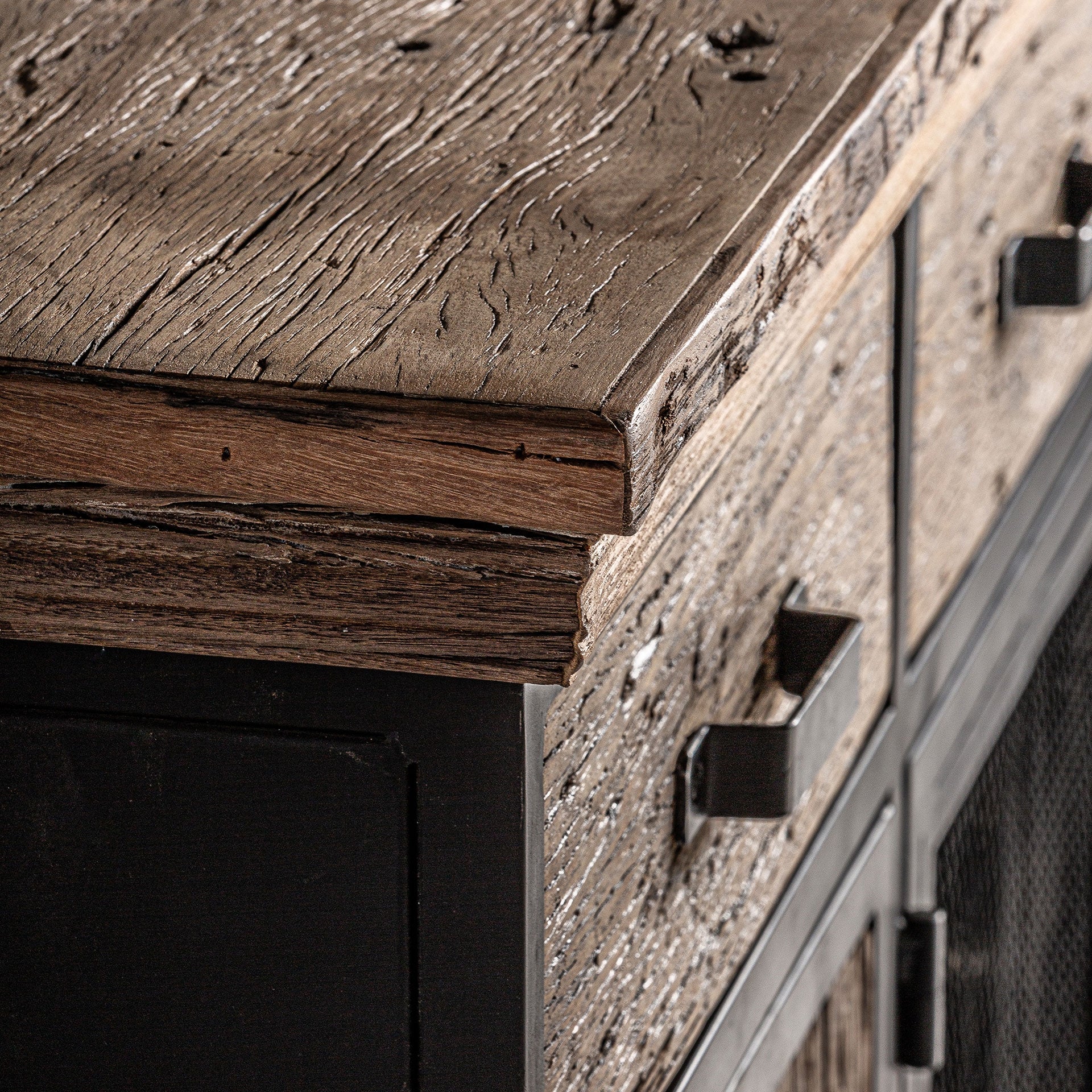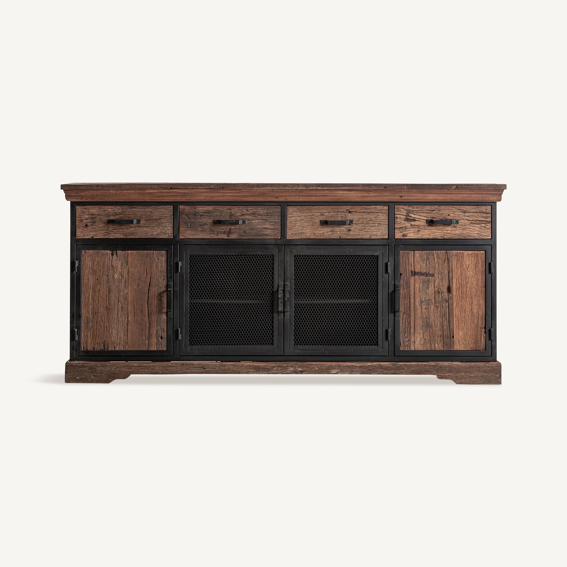Crafted from warm brown reclaimed wood, this sideboard features two solid wood doors and two black metal mesh doors, blending rustic charm with industrial edge. Its balanced layout and natural textures offer both visual appeal and practical storage, ideal for modern dining rooms, lofts, or eclectic interiors.