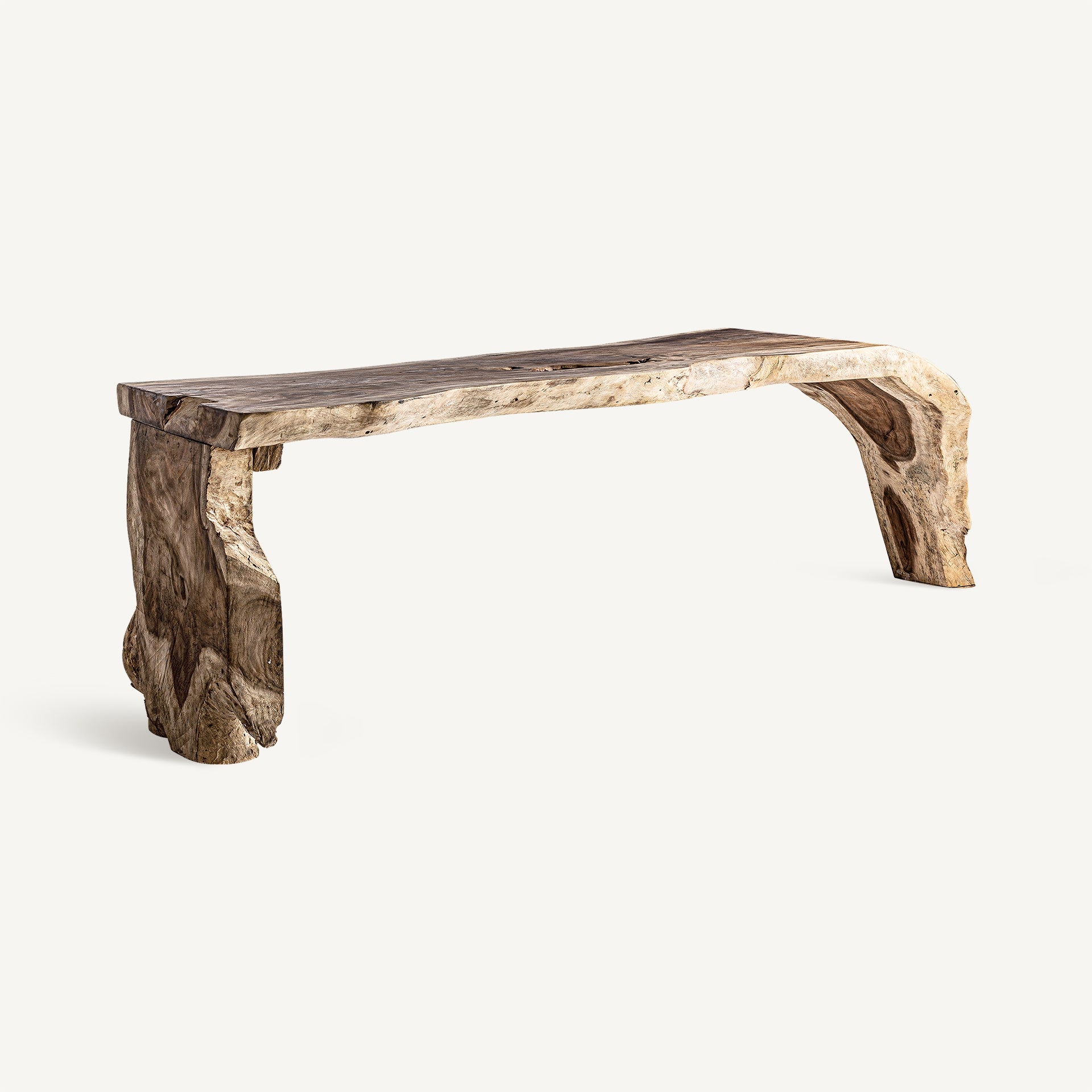 This console table, handcrafted from tropical wood, captivates with its organic form and raw aesthetic. Highlighting the natural contours of the material, it evokes a sense of authenticity and connection to nature. Thanks to its sturdy construction, it can be placed both indoors and outdoors — serving as a bar, a service table, or a sculptural accent in the garden.